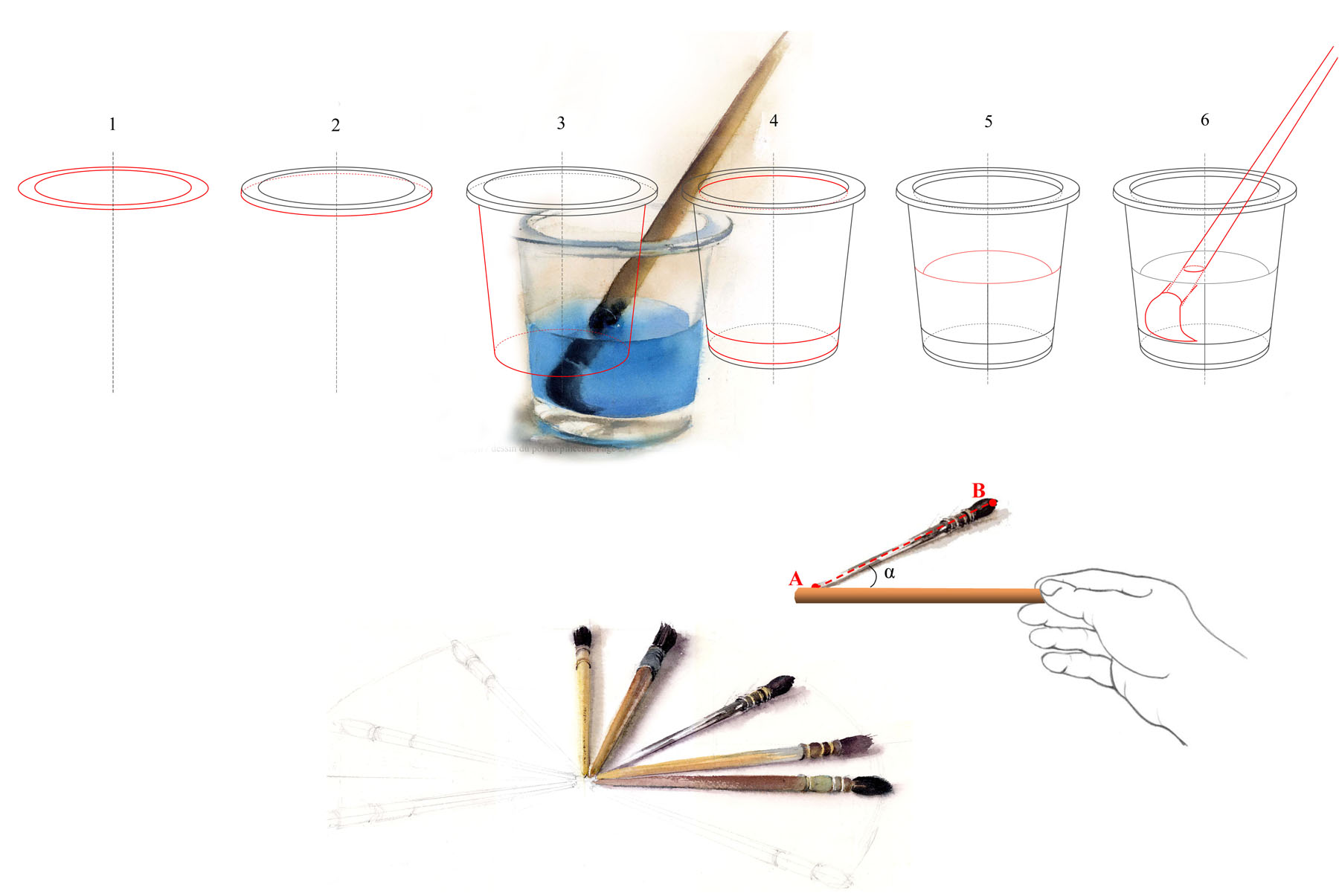 Observation d’objets: Dessin du pot, ellipse, transparence à l’aquarelle – Les pinceaux en éventail, prise de mesures