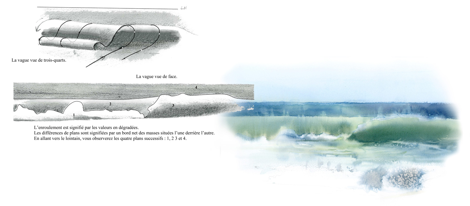 Le paysage: Construction et volume de la vague, l’écume à l’aquarelle